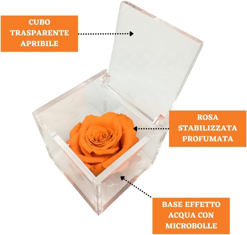 • 🌹 CUBO CON ROSA COLORATA – I nostri cubi con rose stabilizzate colorate sono un regalo originale per ogni occasione speciale. All’interno del cubo trasparente ed apribile, c’è una rosa stabilizzata immersa in un fondo trasparente con bollicine, per ricreare l’effetto di una rosa che galleggia sull’acqua. Ogni cubo racchiude una rosa che sprigiona un’essenza naturale profumata di alta qualità.