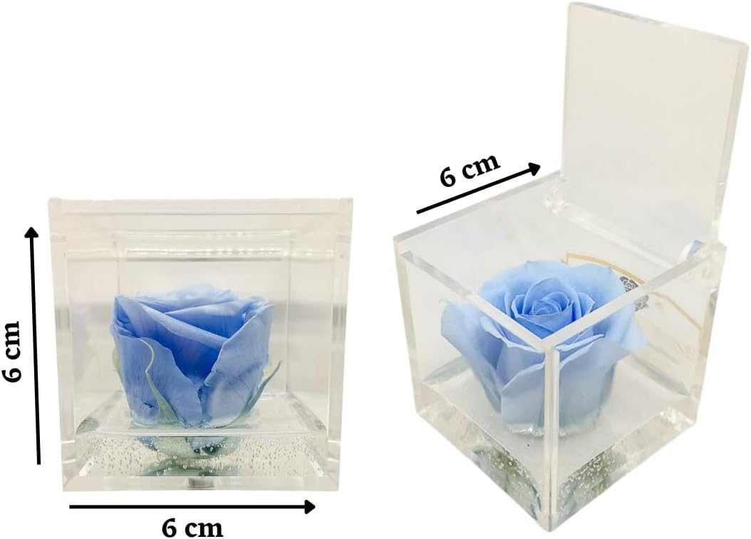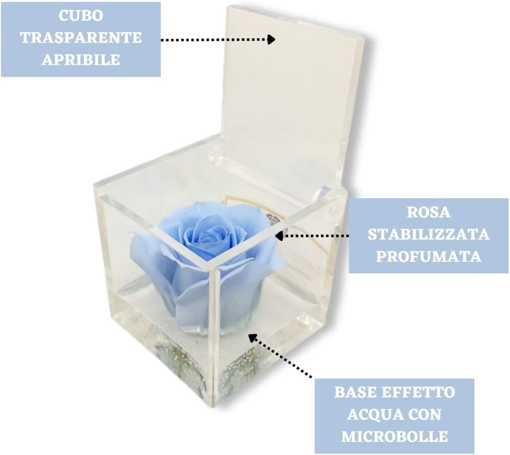 • 🌹 CUBO CON ROSA COLORATA – I nostri cubi con rose stabilizzate colorate sono un regalo originale per ogni occasione speciale. All’interno del cubo trasparente ed apribile, c’è una rosa stabilizzata immersa in un fondo trasparente con bollicine, per ricreare l’effetto di una rosa che galleggia sull’acqua. Ogni cubo racchiude una rosa che sprigiona un’essenza naturale profumata di alta qualità.