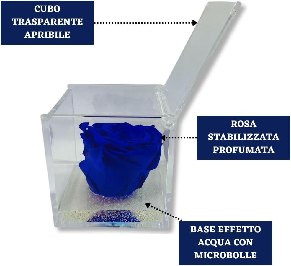 • 🌹 CUBO CON ROSA COLORATA – I nostri cubi con rose stabilizzate colorate sono un regalo originale per ogni occasione speciale. All’interno del cubo trasparente ed apribile, c’è una rosa stabilizzata immersa in un fondo trasparente con bollicine, per ricreare l’effetto di una rosa che galleggia sull’acqua. Ogni cubo racchiude una rosa che sprigiona un’essenza naturale profumata di alta qualità.