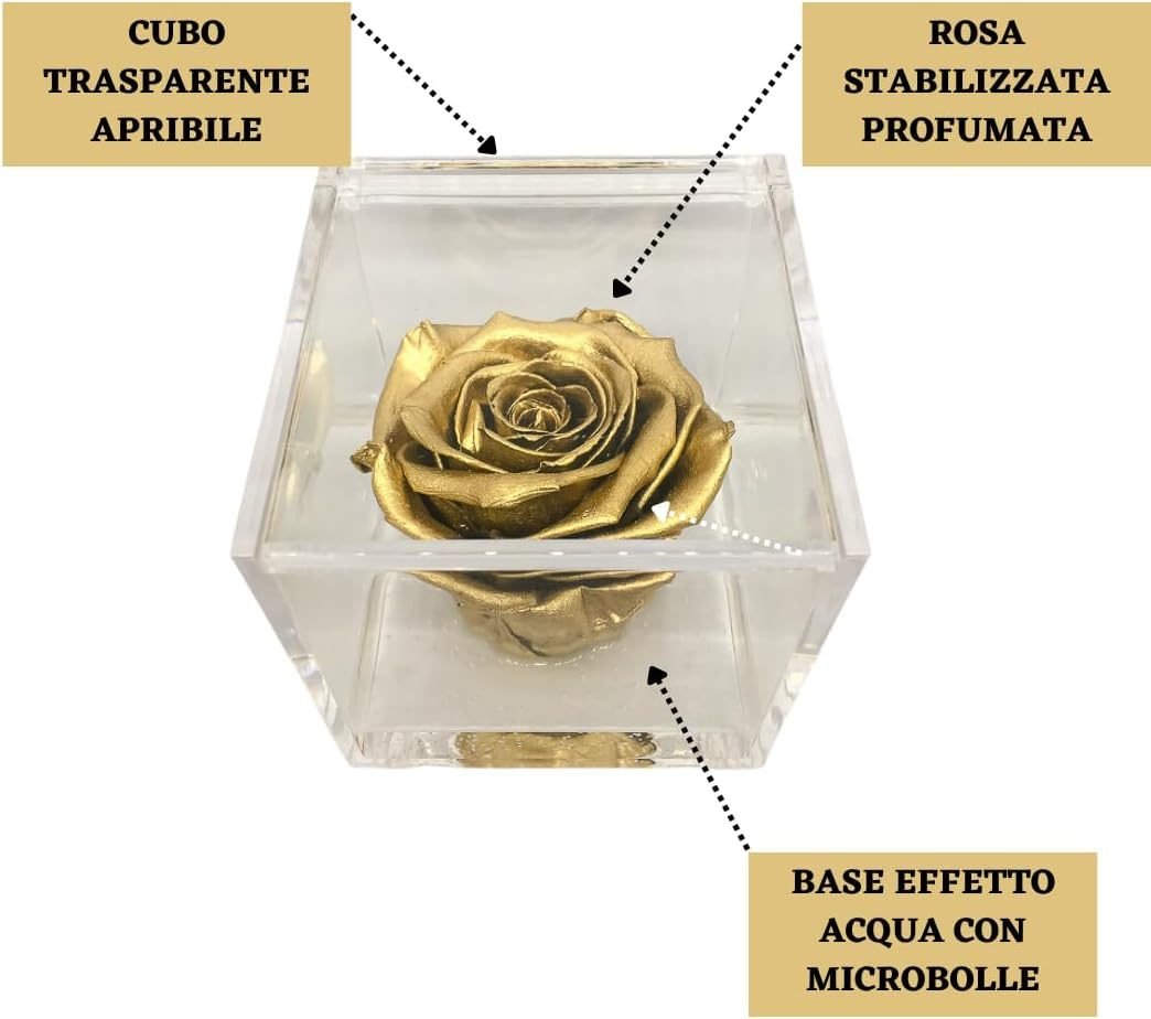 • 🌹 CUBO CON ROSA COLORATA – I nostri cubi con rose stabilizzate colorate sono un regalo originale per ogni occasione speciale. All’interno del cubo trasparente ed apribile, c’è una rosa stabilizzata immersa in un fondo trasparente con bollicine, per ricreare l’effetto di una rosa che galleggia sull’acqua. Ogni cubo racchiude una rosa che sprigiona un’essenza naturale profumata di alta qualità.