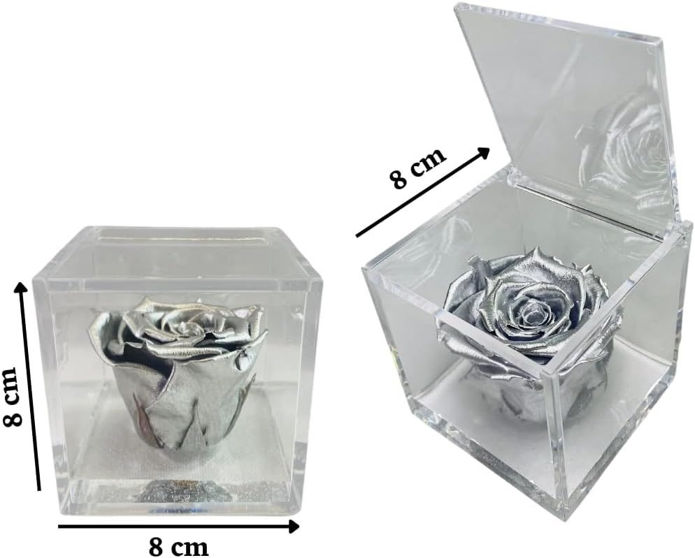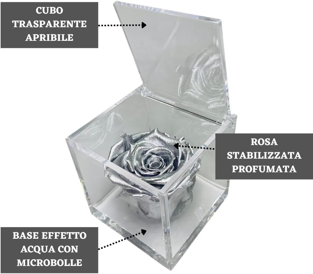 • 🌹 CUBO CON ROSA COLORATA – I nostri cubi con rose stabilizzate colorate sono un regalo originale per ogni occasione speciale. All’interno del cubo trasparente ed apribile, c’è una rosa stabilizzata immersa in un fondo trasparente con bollicine, per ricreare l’effetto di una rosa che galleggia sull’acqua. Ogni cubo racchiude una rosa che sprigiona un’essenza naturale profumata di alta qualità.