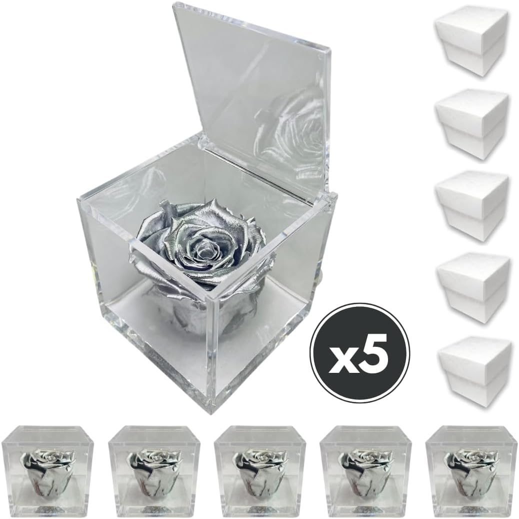PremiumRose 5 Cubi Rosa Argento Stabilizzata e Profumata da 8 cm con Rosa Eterna Vera, Idea Regalo Mamma, Fidanzata, Amica, Idea