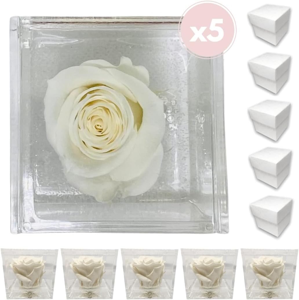 PremiumRose 5 Cubi Rosa Bianca Stabilizzata e Profumata da 6 cm con Rosa Eterna Vera, Idea Regalo Mamma, Fidanzata, Amica, Idea