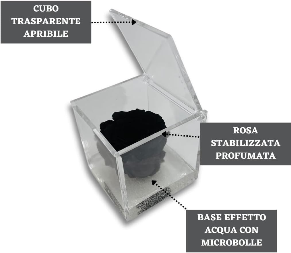 • 🌹 CUBO CON ROSA COLORATA – I nostri cubi con rose stabilizzate colorate sono un regalo originale per ogni occasione speciale. All’interno del cubo trasparente ed apribile, c’è una rosa stabilizzata immersa in un fondo trasparente con bollicine, per ricreare l’effetto di una rosa che galleggia sull’acqua. Ogni cubo racchiude una rosa che sprigiona un’essenza naturale profumata di alta qualità.